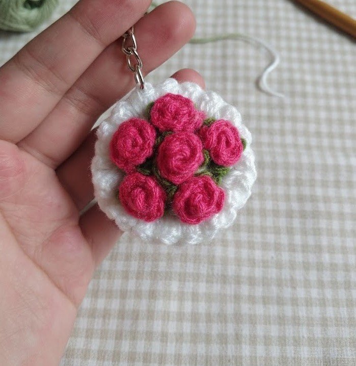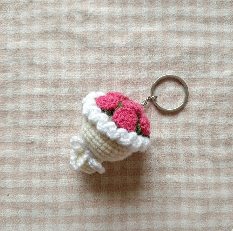 A Tiny Bouquet of Happiness – Hand-Crocheted Floral Keychain…perfect little accessory that screams “𝓪𝓮𝓼𝓽𝓱𝓮𝓽𝓲𝓬”. This gorgeous crochet keychain features a cluster of delicate pink roses, wrapped up lovingly just like a real bouquet.
