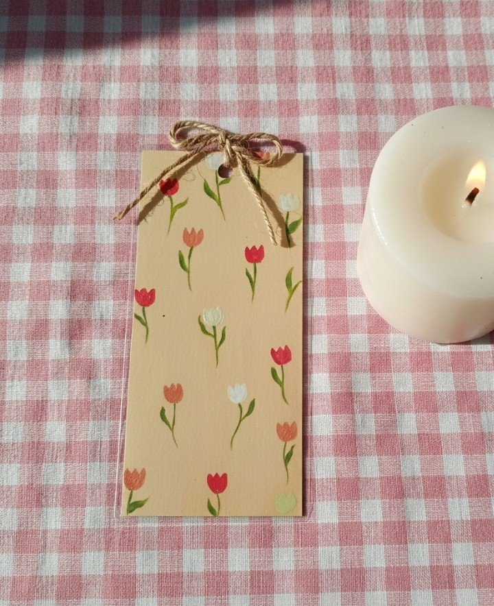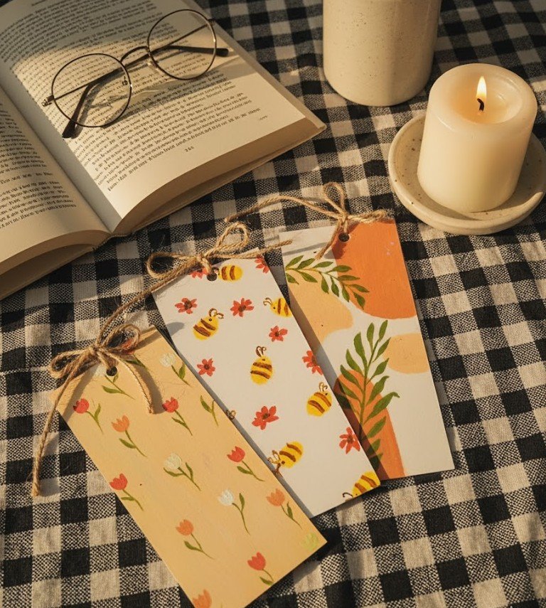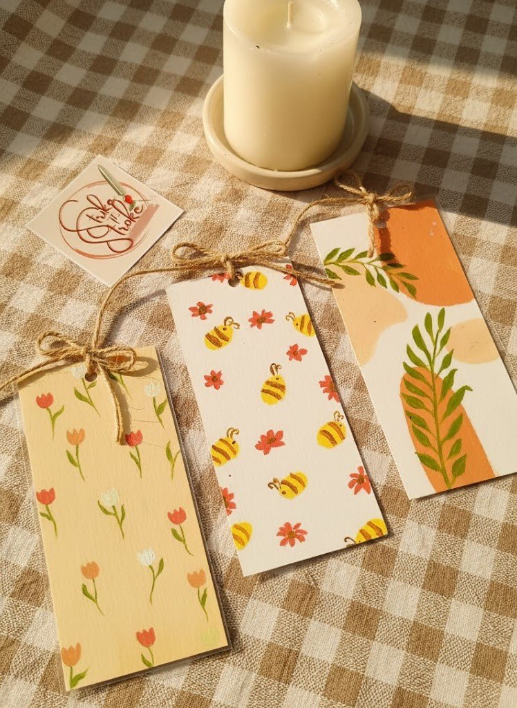 the handmade bookmarks featuring 3 artworks 1.) cute little bees with orange lilies, 2.) colorful tulips on beige background 3.) boho art bookmark with leaves that bring a cottage core girl vibe to your reading time.